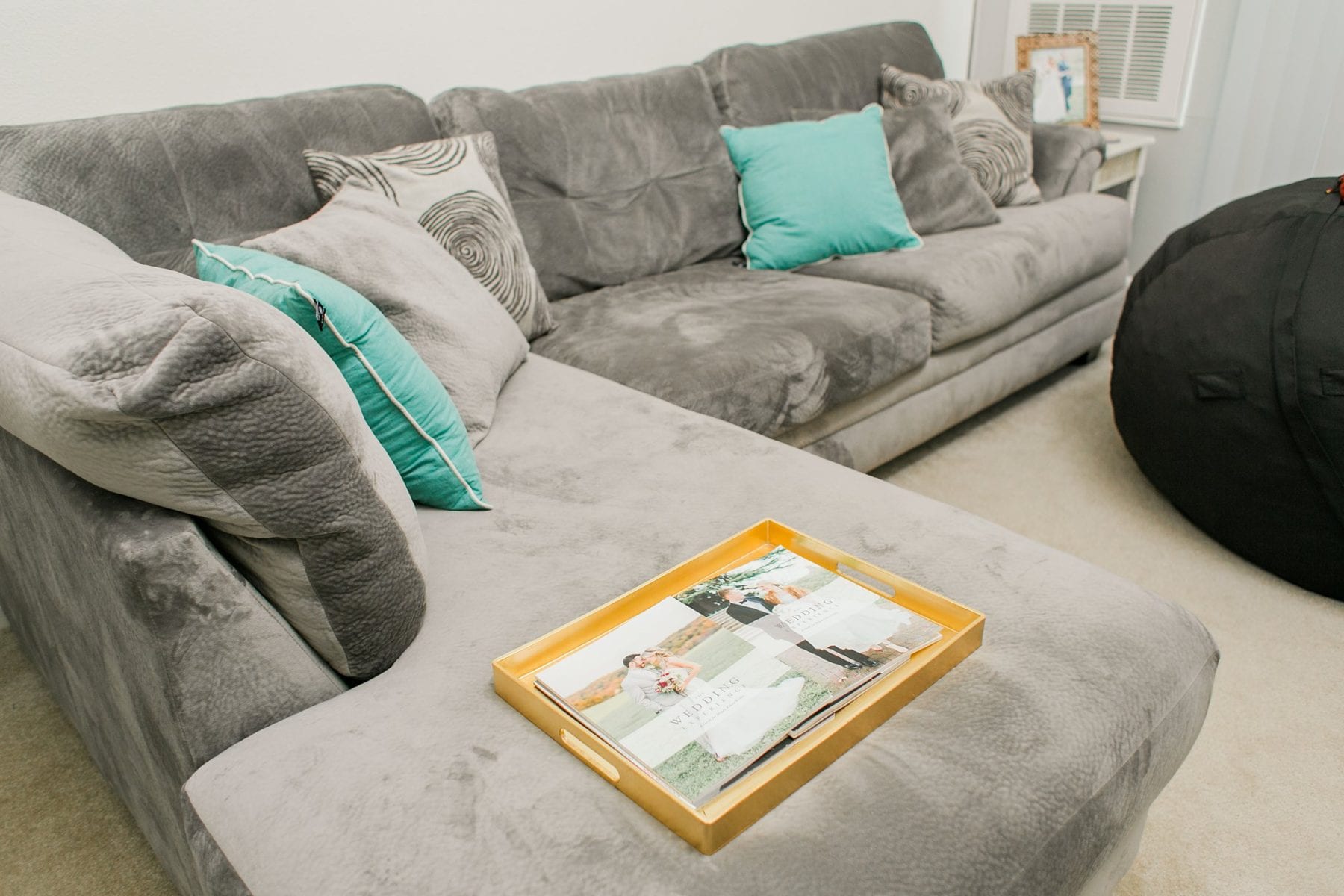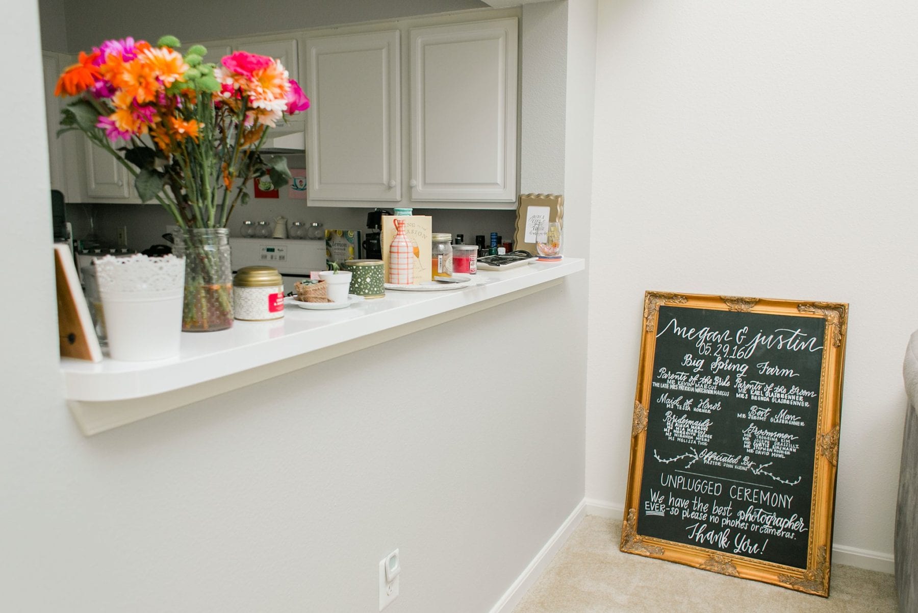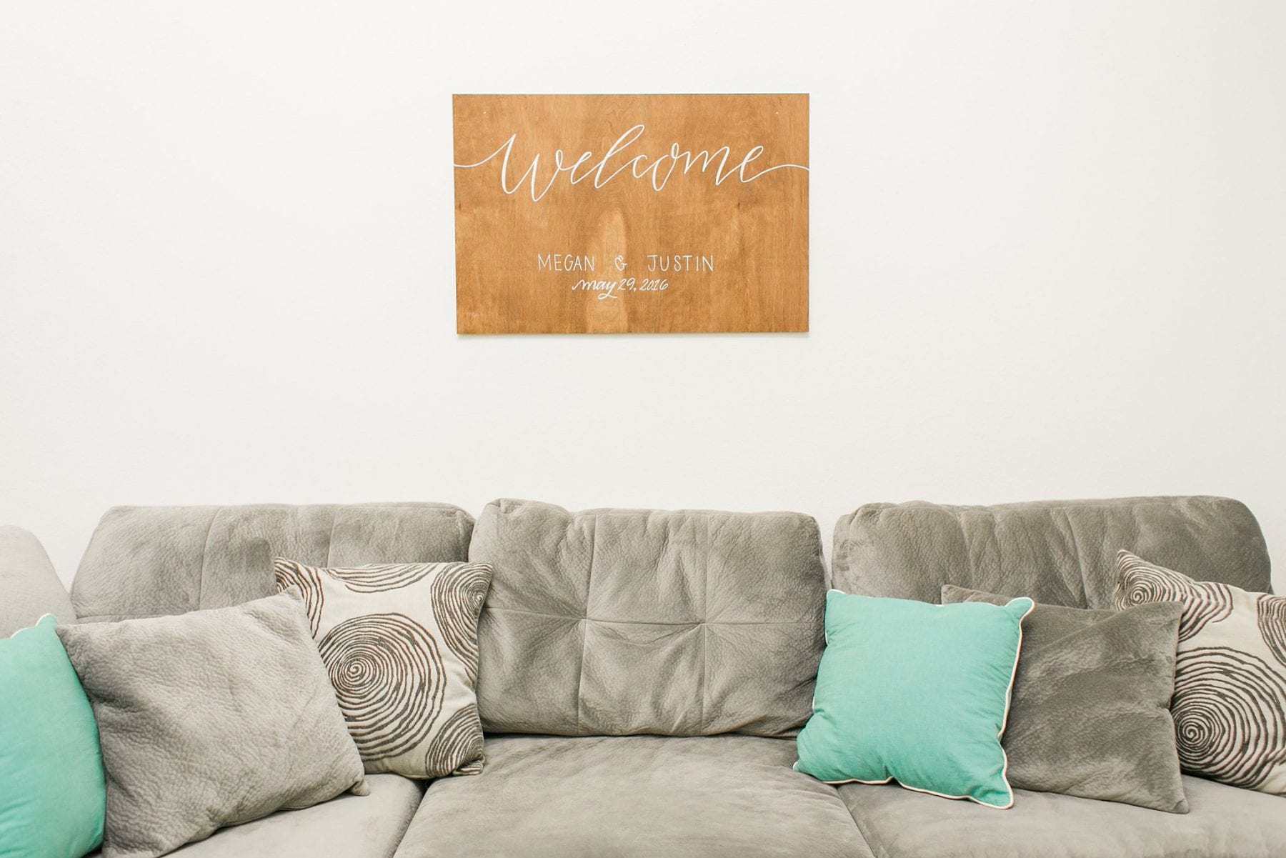 Couch – Value City Furniture | Welcome Sign – Hello Love Events | Placemats – Ikea | Gold Frame – Hobby Lobby | Gold Tray – Target | Gold Ampersand – Hobby Lobby | Bean Bag – Love Sac