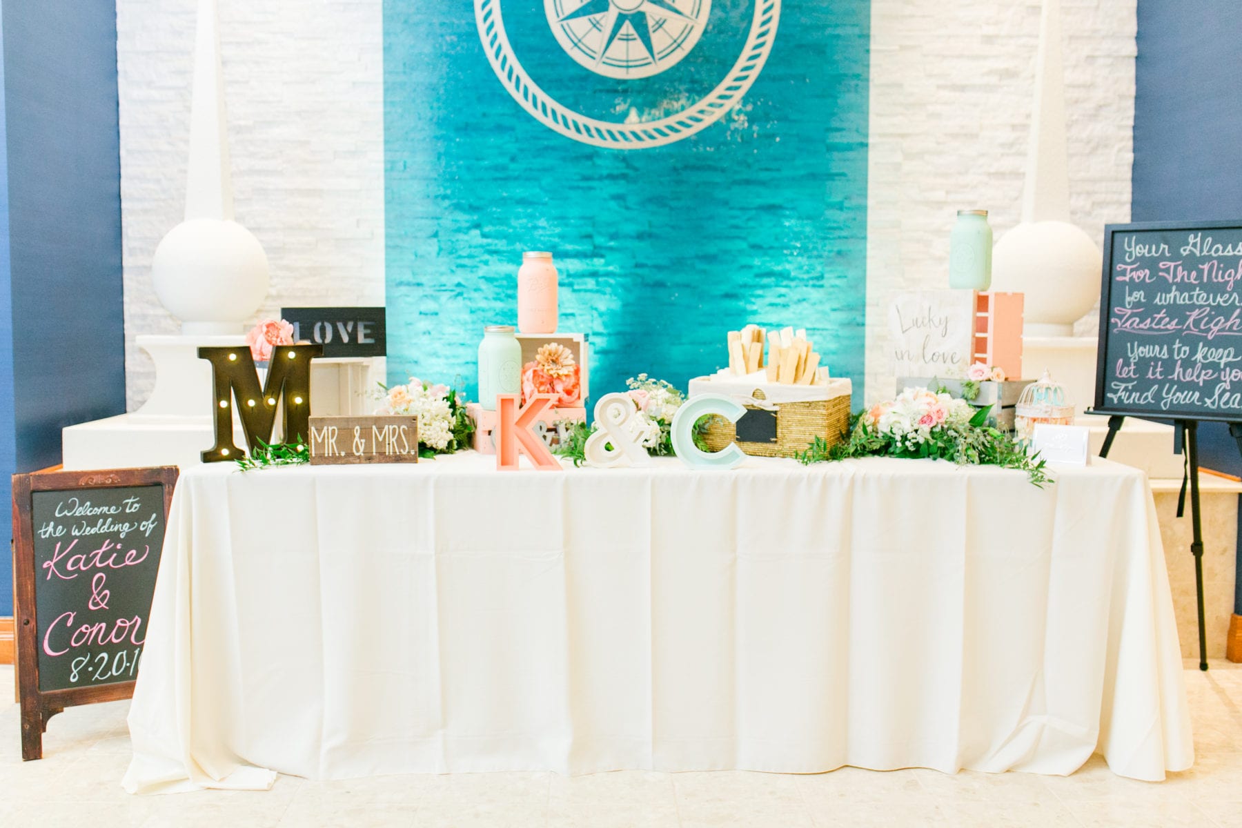 I’m so excited to share this wedding day! I first met Katie and Conor last fall for their engagement session in D.C. and they filled me in on how they met, what their families are like, and what they were envisioning for their wedding day almost one year in the future. Well, that day arrived a couple of weeks ago on a warm summer day at Water’s Edge! This venue was the perfect mix of a coastal vibe with modern flair. Katie got ready in a gorgeous ivory-walled bridal suite and walked down the aisle at a ceremony site that faced the blue waters of the Chesapeake Bay. Guests then enjoyed an indoor/outdoor cocktail hour while the ballroom was prepared for the reception to begin. The colors of the uplighting set the perfect mood during dinner hour for guests to visit and then for the dancing to begin!